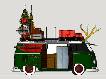 Created as a lead vehicle for a popular holiday parade in Atlanta Georgia. The classic VW bus rack is outfit with a throwe for Santa, color matched presents and giant gold leaf antlers.